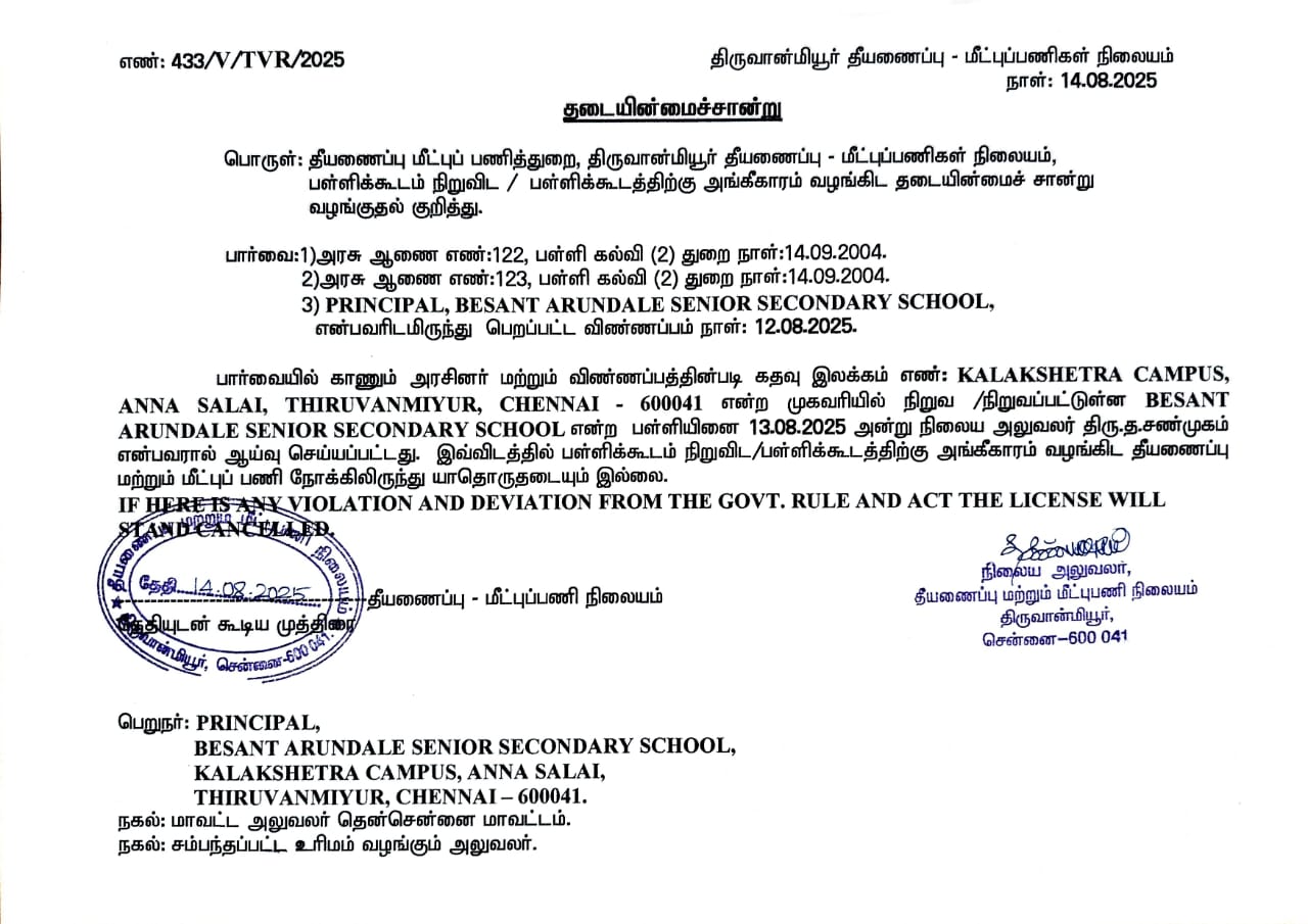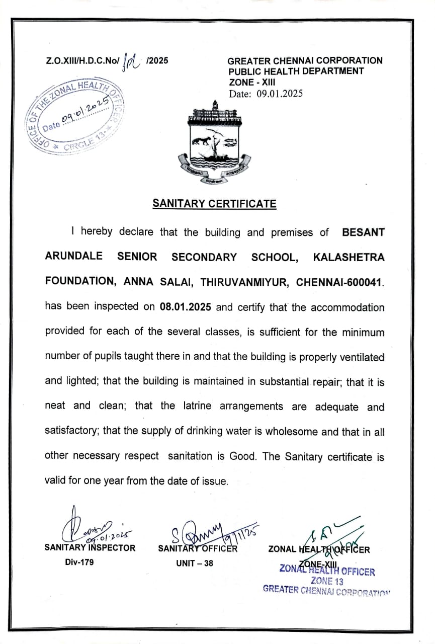 | 4 | Complete Address with Pin | BESANT ARUNDALE SENIOR SECONDARY SCHOOL, KALAKSHETRA FOUNDATION, THIRUVANMIYUR, CHENNAI – 600041 |